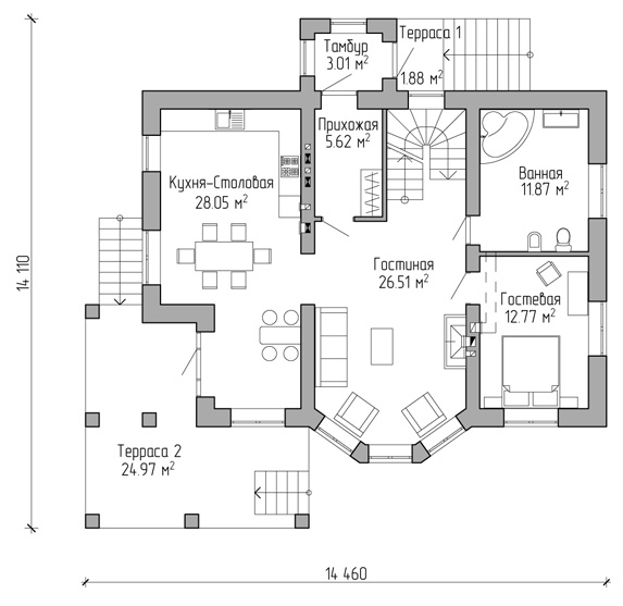 Современный двухэтажный дом с цокольным этажом и террасой. При компактной планировке максимально насыщен с функциональной и архитектурной точек зрения. Лаконичная отделка фасада придает коттеджу строгий респектабельный вид.